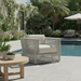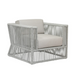 The Miami Club Chair embodies clean lines and thoughtful angles with its box frame and striated rope design. Its rust-free aluminum frame is expertly hand-wrapped with premium all-weather olefin rope in a silver-grey finish, and features a box frame with pinched back leg detail.