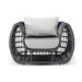 An outdoor club chair perfect for garden or poolside soirees. With a handsome profile and an urban tropical look, the Nest chair features sturdy construction of all-weather wicker wrapped around a lightweight aluminum frame. Over time, more elements were added to the collection, resulting in a comprehensive offering. The Nest is offered in a graphite finish topped with plush cushions covered in all-weather acrylic Sunbrella fabrics. Nest or entertain al fresco in subtle style.