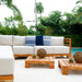 The commanding presence of this sectional will instantly transform any outdoor space into a go-to destination. Its modularity allows for maximum flexibility in countless configurations. Relax in this deep seating set made from solid teak wood and thick, comfortable cushions covered in beautiful Sunbrella fabric.