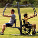 The Accessible Chest Press is designed to utilize the same outdoor exercise technology as fitness workout stations in gyms and fitness centers such as a bench press machine. This double-sided piece reserves one side for mobile device use, the other side has a seat available. Isokinetic springs activate to provide smooth resistance and workout-targeted strength training zones.