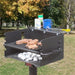 All welded cooking grate construction: 5/8" dia. steel bars for support handles, 1/2" dia. steel bars for cooking surface. All grate bars are welded on both sides. Grate is permanently incorporated into firebox and cannot be removed. Grate tips up for easy operation. Handle grips are 1/8" x 1/2" coiled steel bar.